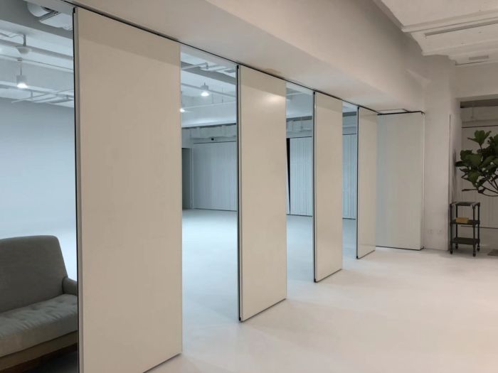 大型移动隔断摈弃了以往地面轨道形式,采用顶置式轨道安装,避免地轨扬尘导致轮阻。